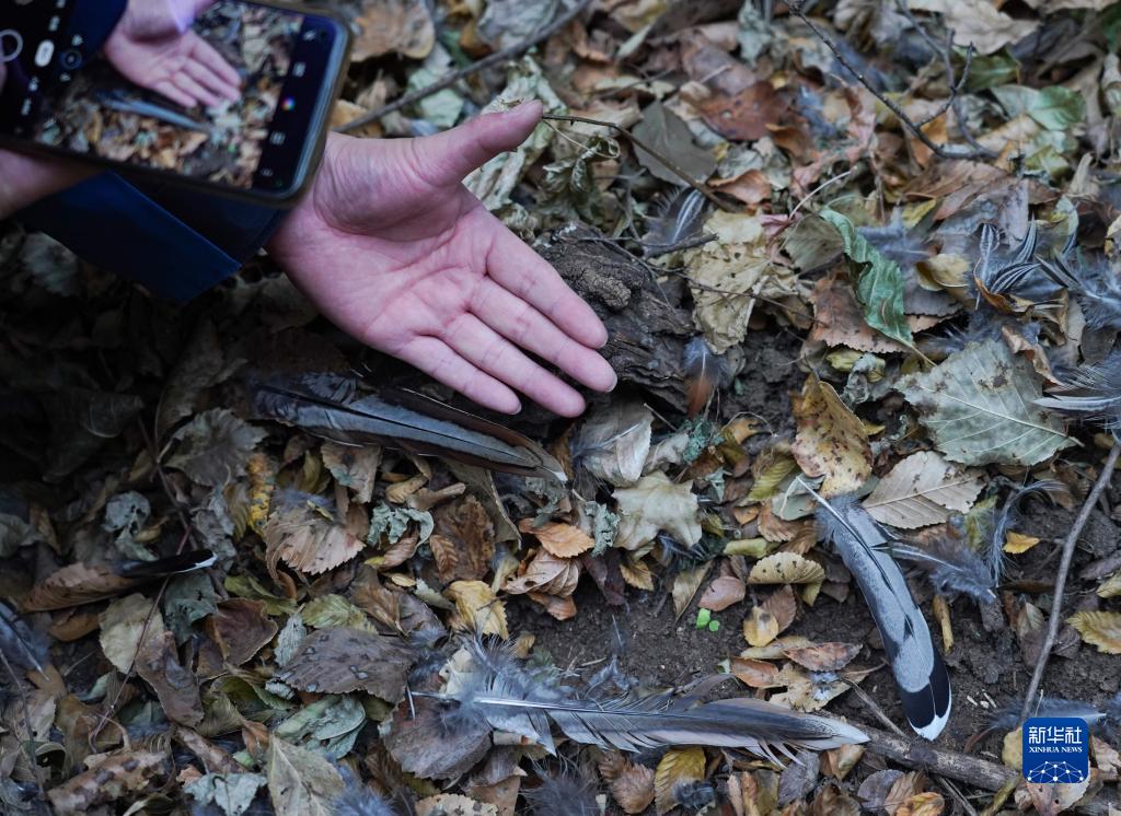 保護區工作人員給地上的羽毛拍照,用于辨別物種信息(11月9日攝)。