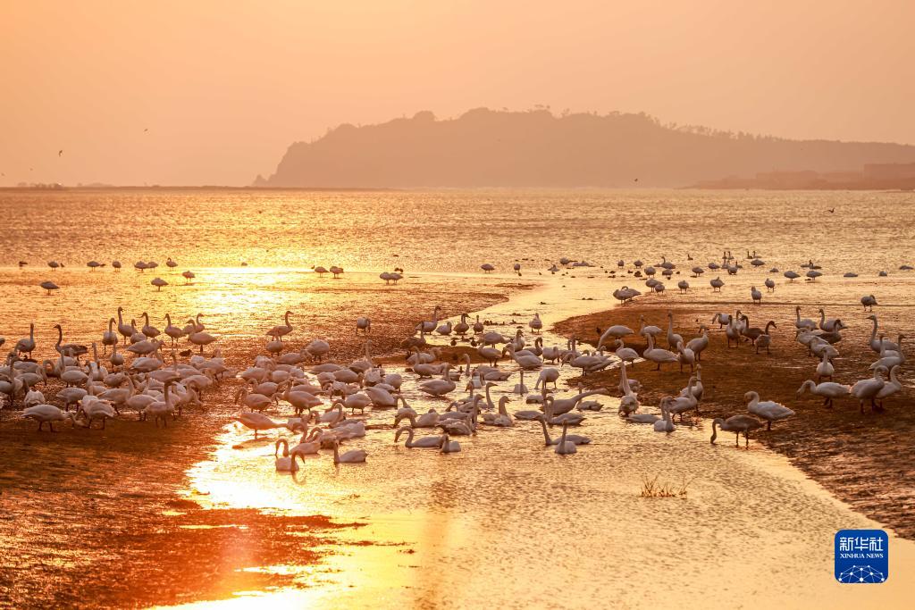 近日,大批大天鵝飛抵山東省榮成市成山鎮天鵝湖濕地棲息越冬,場(chǎng)面蔚為壯觀(guān),吸引眾多游客前來(lái)欣賞。