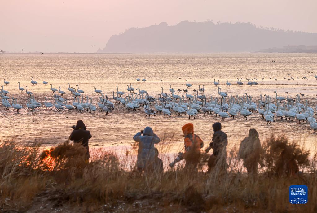 近日,大批大天鵝飛抵山東省榮成市成山鎮天鵝湖濕地棲息越冬,場(chǎng)面蔚為壯觀(guān),吸引眾多游客前來(lái)欣賞。