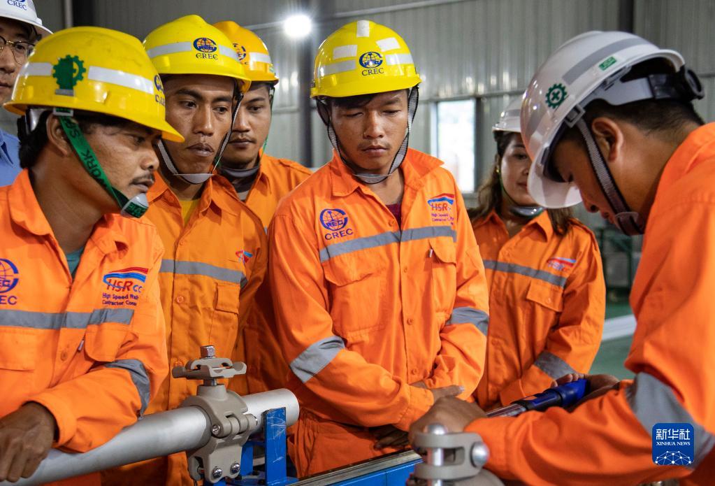 11月13日,在印度尼西亞萬(wàn)隆,印尼員工在中國中鐵電氣化局雅萬(wàn)高鐵資源管理中心學(xué)習中國標準“簡(jiǎn)統化”接觸網(wǎng)零部件裝配工藝。
