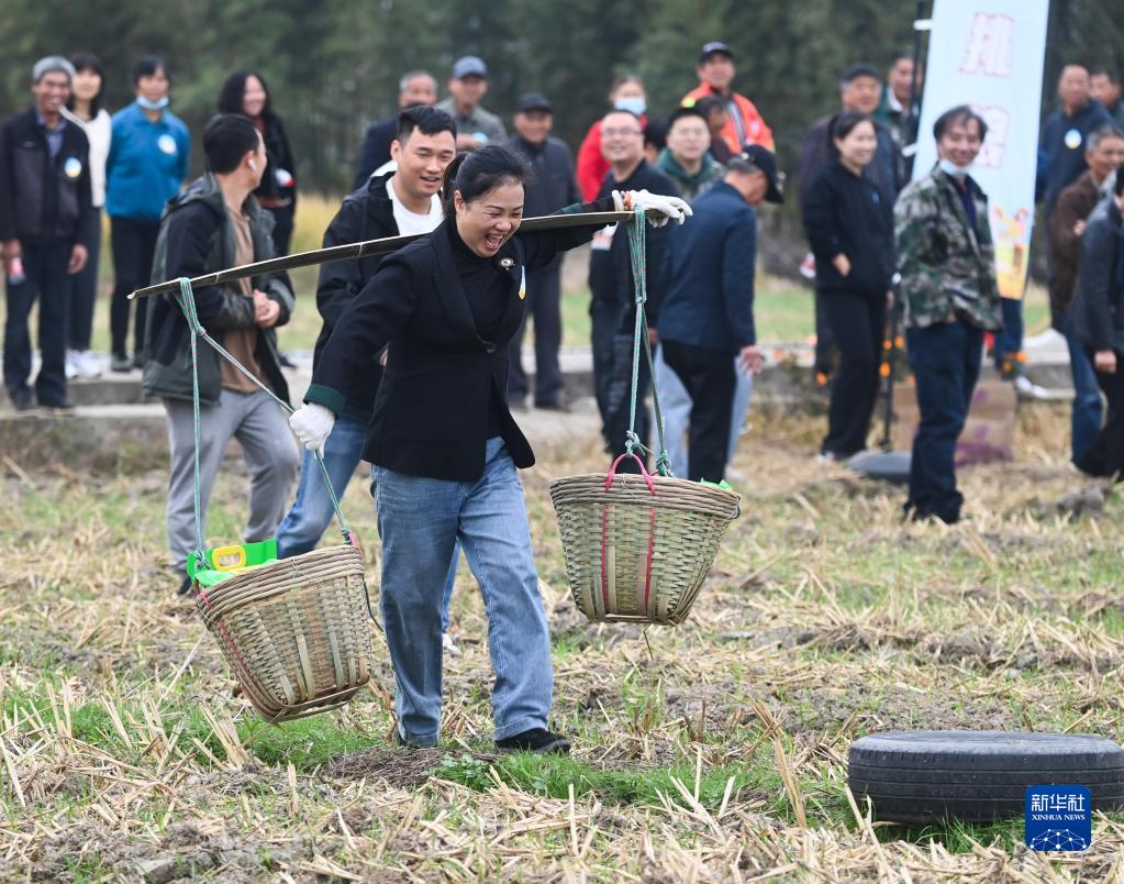 11月15日,參賽村民參加“扁擔挑糧”趣味比賽。