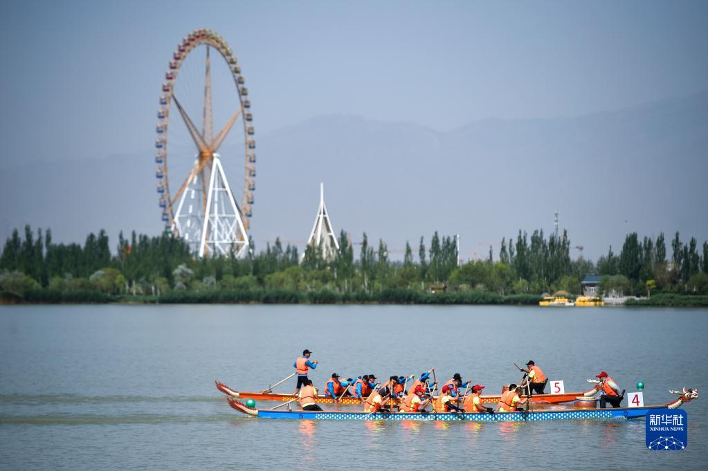 市民在寧夏銀川市閱海國家濕地公園參加龍舟比賽(2019年6月5日攝)。