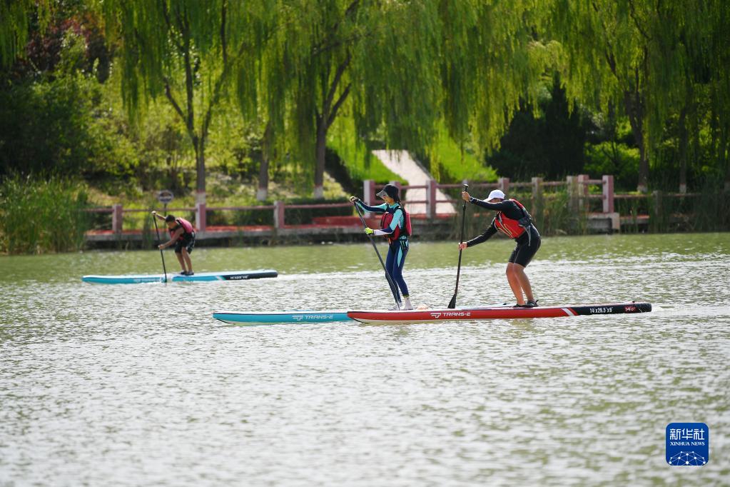 市民在寧夏銀川市典農河上休閑運動(dòng)(2022年8月7日攝)。