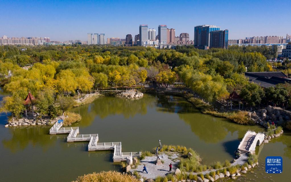 市民在寧夏銀川市海寶公園內健身休閑(2019年10月26日攝,無(wú)人機照片)。