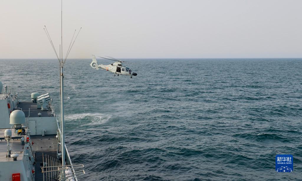 中國海軍第41批護航編隊組織實(shí)戰化訓練,艦載直升機起飛離艦(7月16日攝)。