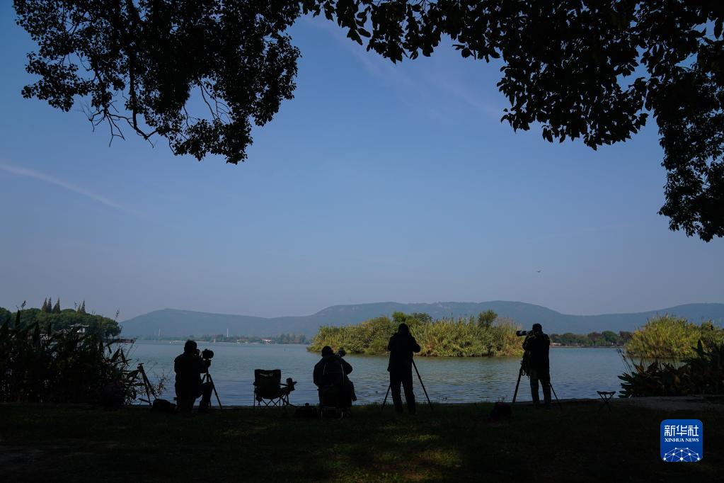 11月15日,攝影愛(ài)好者在尚湖國家城市濕地公園拍鳥(niǎo)。 新華社記者 季春鵬 攝