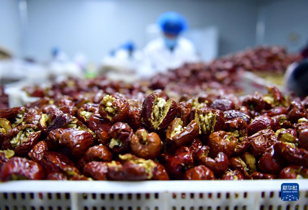 11月16日,在河南省夏邑縣桑堌鄉5G電商園,員工在包裝棗夾核桃。