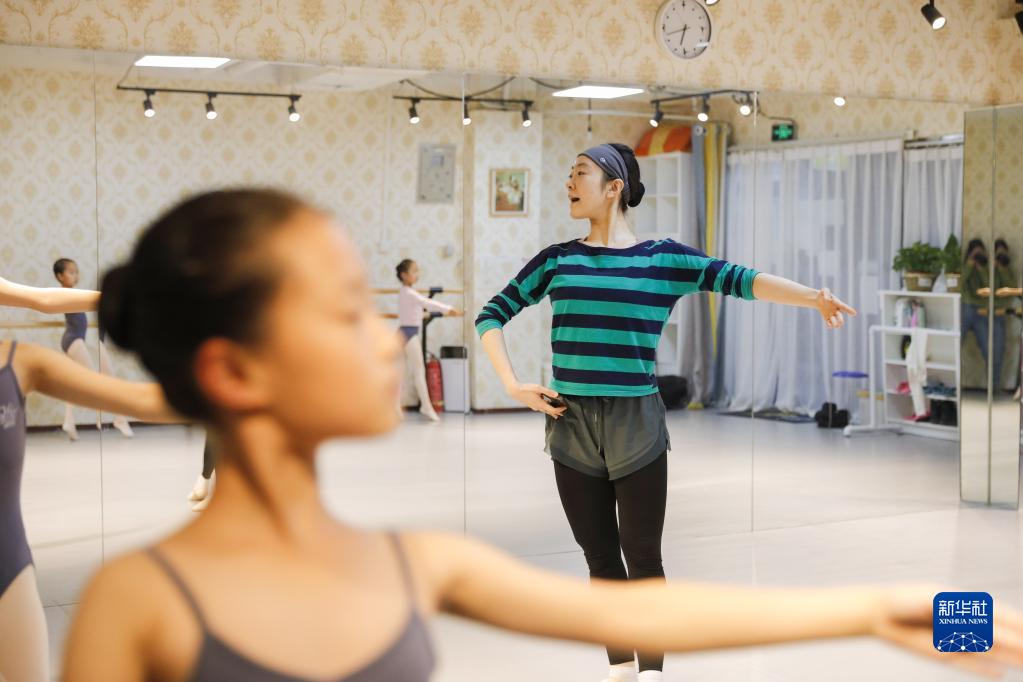 11月4日,在北京的舞蹈教室,趙蘊輝帶領(lǐng)學(xué)生進(jìn)行芭蕾訓練。 新華社記者 方欣 攝
