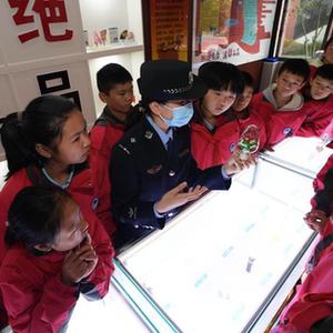11月17日,民警在貴州省遵義市第四十中學(xué)禁毒教育基地為學(xué)生講解禁毒知識。