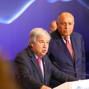 11月17日,聯(lián)合國秘書(shū)長(cháng)古特雷斯(左)在埃及沙姆沙伊赫舉行的記者會(huì )上發(fā)言。