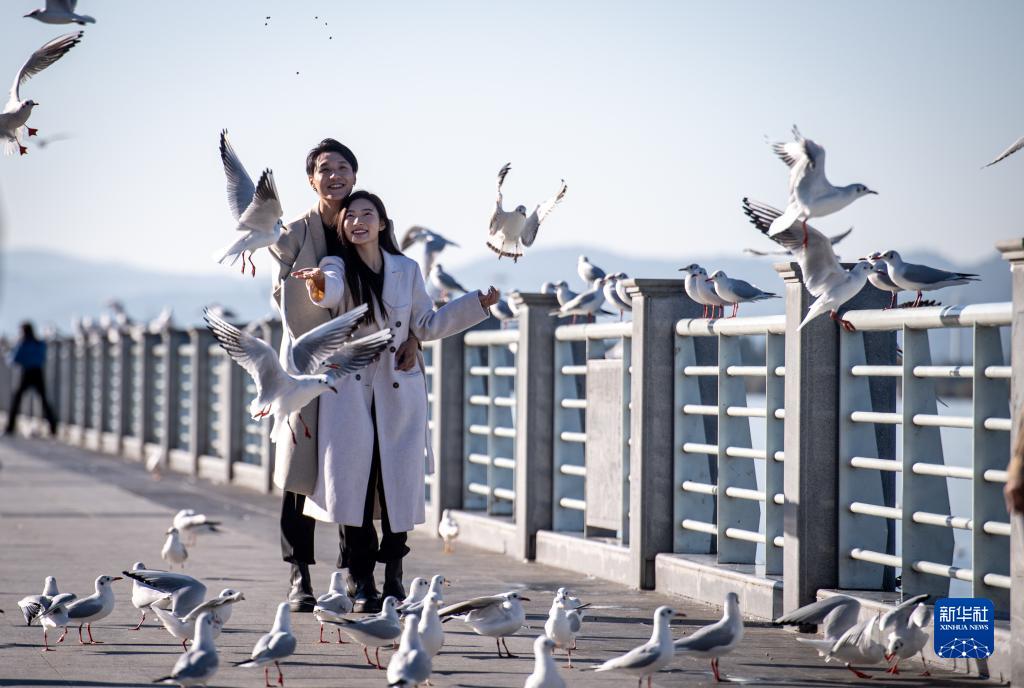 11月17日,市民在海埂大壩投喂紅嘴鷗。