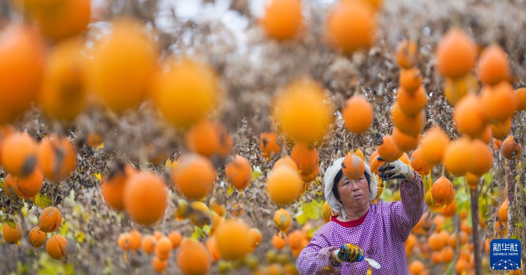 11月18日,山東省鄒平市孫鎮懷家村農民在瓜蔞基地采收瓜蔞種。
