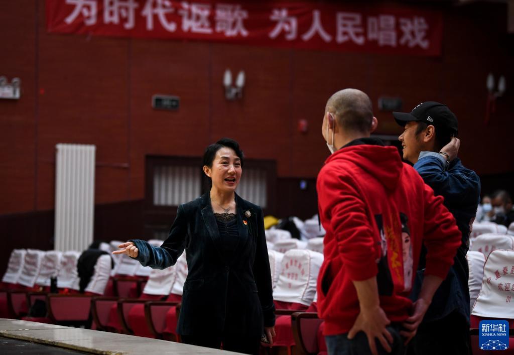 11月1日,在位于銀川市的寧夏秦腔劇院,侯艷(左)同演職人員交流節目排練情況。