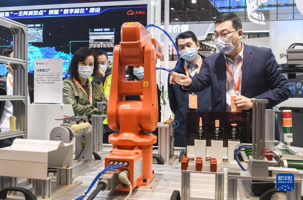 11月20日,工作人員向參觀(guān)者介紹5G智能工廠(chǎng)生產(chǎn)場(chǎng)景。