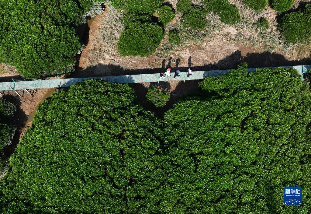 張潮巨和同事在閩江河口濕地核心區域觀(guān)測紅樹(shù)林的生長(cháng)狀況(11月19日攝,無(wú)人機照片)。