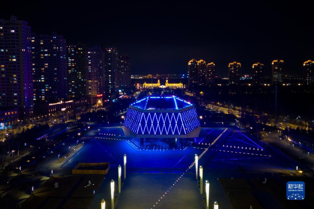 11月20日,哈爾濱音樂(lè )廳為世界兒童日亮燈(無(wú)人機照片)。