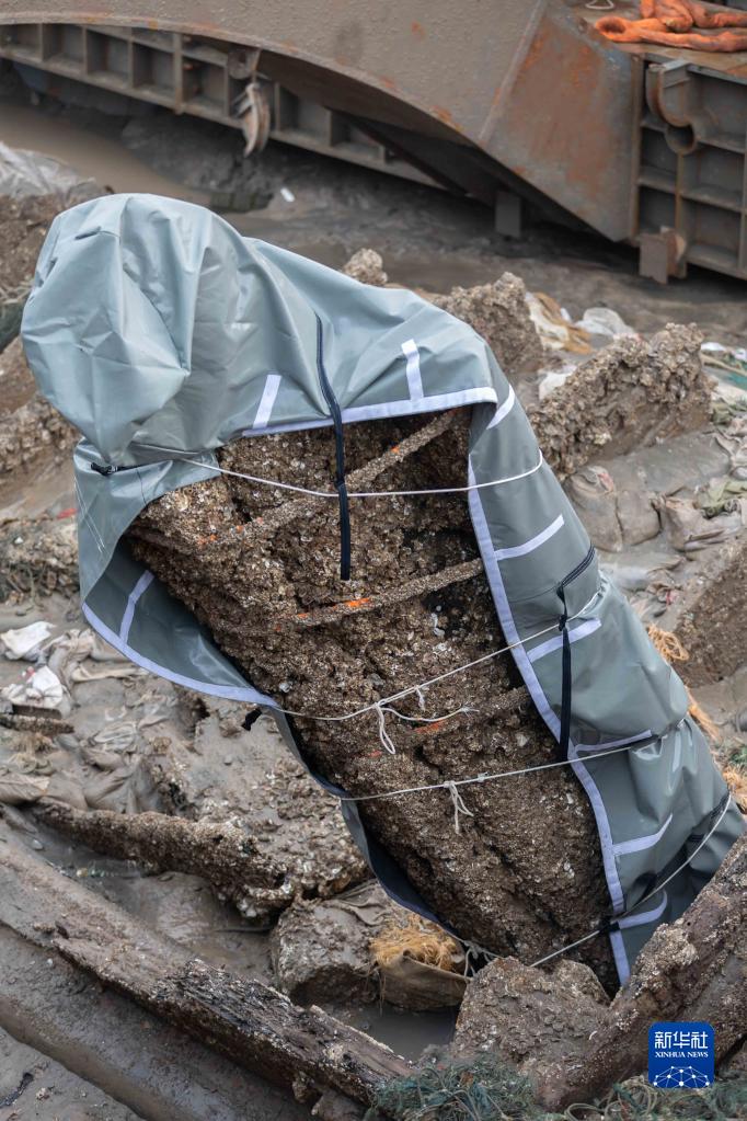 采用世界首創(chuàng )的“弧形梁非接觸文物整體遷移技術(shù)”, 我國迄今水下考古發(fā)現的體量最大的木質(zhì)沉船——長(cháng)江口二號古船21日在長(cháng)江口水域成功實(shí)施整體打撈。隨著(zhù)打撈進(jìn)展有序推進(jìn),21日清晨,長(cháng)江口二號古船船體已局部露出水面,初露真容。