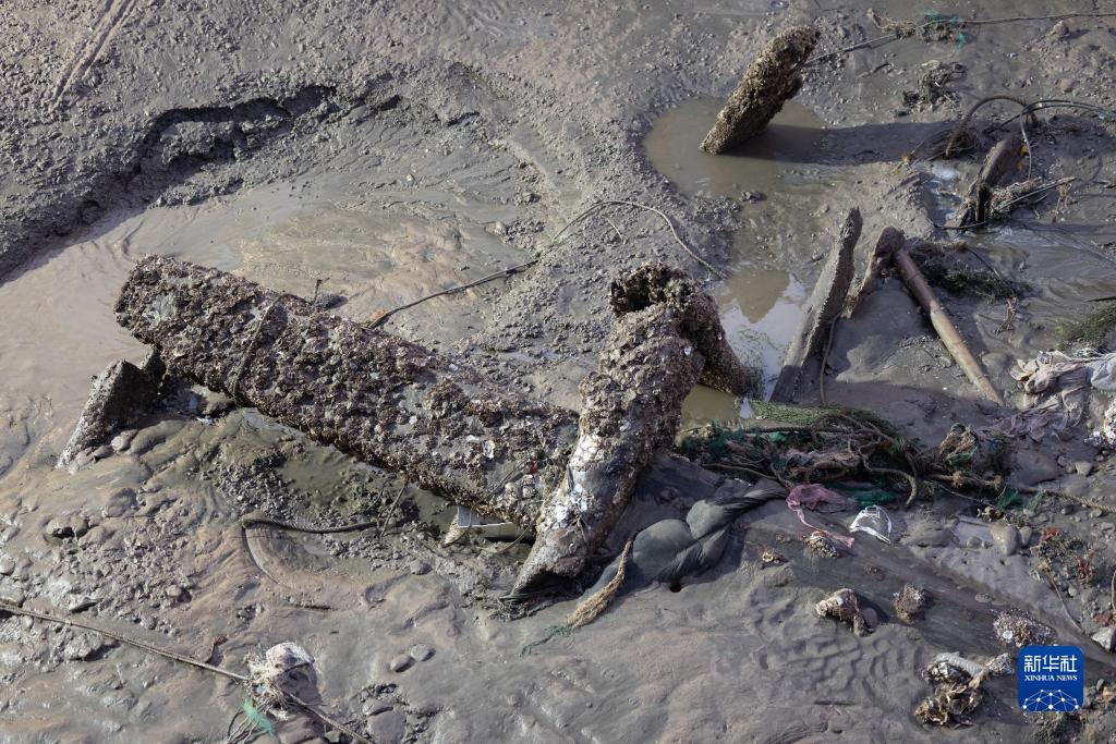11月21日清晨拍攝的露出水面的古船船體局部。
