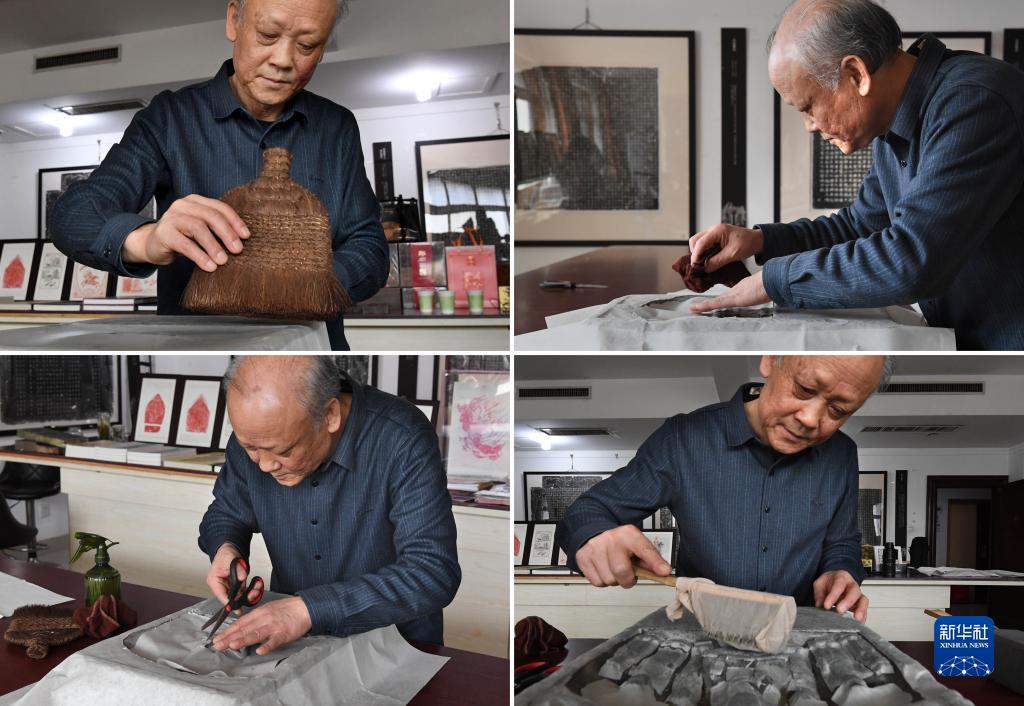 在位于鄭州市金水區文化館的工作室里,李仁清進(jìn)行上紙、剪紙、砸刷等工序(拼版照片,11月16日攝)。