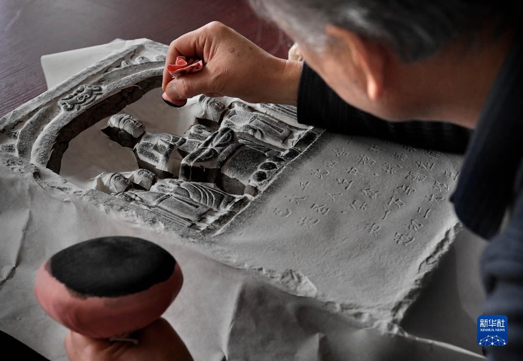 上紙、噴濕、剪紙、砸刷、晾干、撲墨、粘接、修復……一系列流程下來(lái),立體石雕磚上的雕像就纖毫畢現地展露在平面拓片之上,59歲的李仁清拿起拓片仔細地檢查著(zhù)每一處細節。