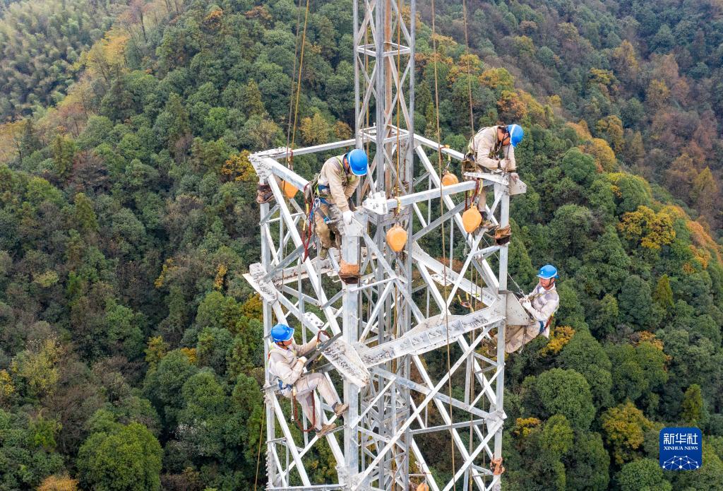 11月20日,安徽送變電工程有限公司施工人員在大山中組立220千伏輸電鐵塔(無(wú)人機照片)。