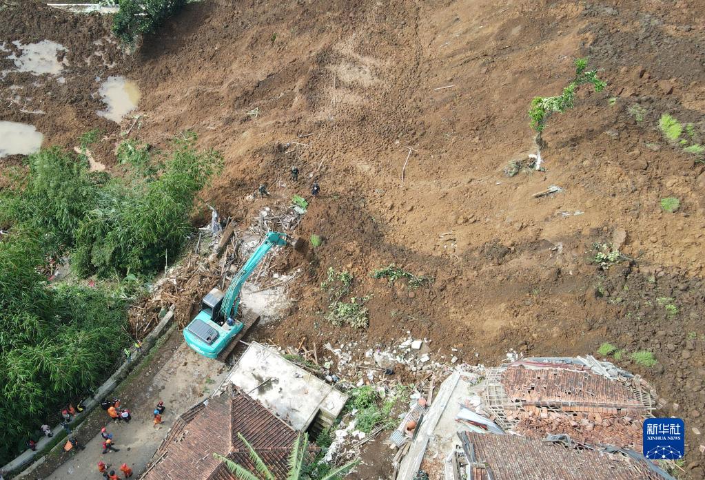 11月22日,救援人員在印度尼西亞西爪哇省展玉地區地震震中附近的山體滑坡現場(chǎng)開(kāi)展救援(無(wú)人機照片)。