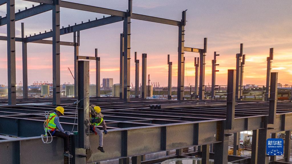 這是黨員突擊隊成員在建設廣西中偉新能源科技有限公司新能源材料基地一期工程(2021年8月27日攝,無(wú)人機照片)。