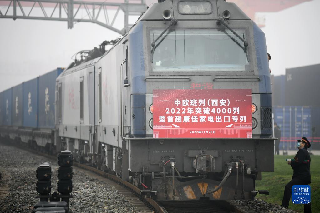11月23日,滿(mǎn)載家電產(chǎn)品的中歐班列在西安國際港站等待發(fā)車(chē)。