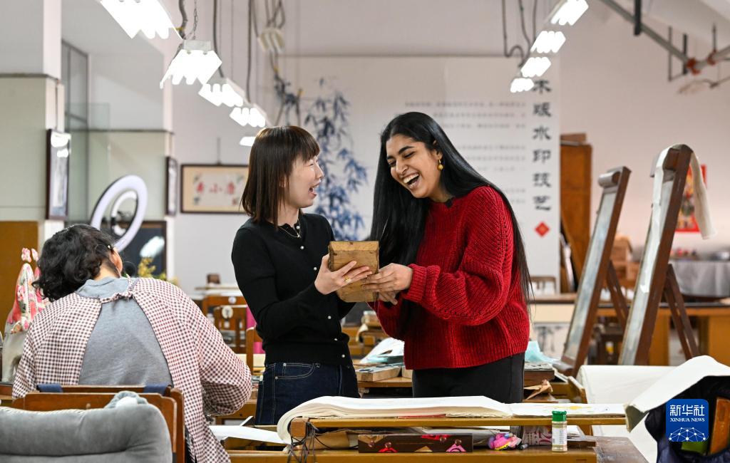 在天津楊柳青木版年畫(huà)博物館勾描工作室,天津楊柳青畫(huà)社彩繪藝人王艷(中)與辛格就木版水印技藝交談(11月17日攝)。