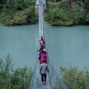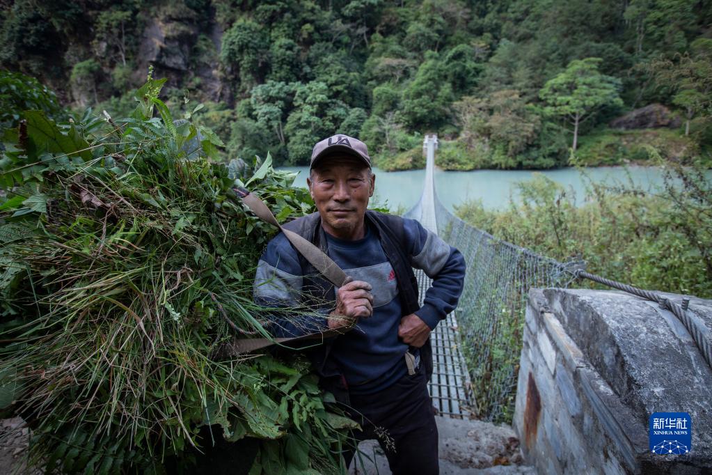 11月8日,在尼泊爾勒姆宗縣,村民走過(guò)水電站項目公司幫助修繕的吊橋。