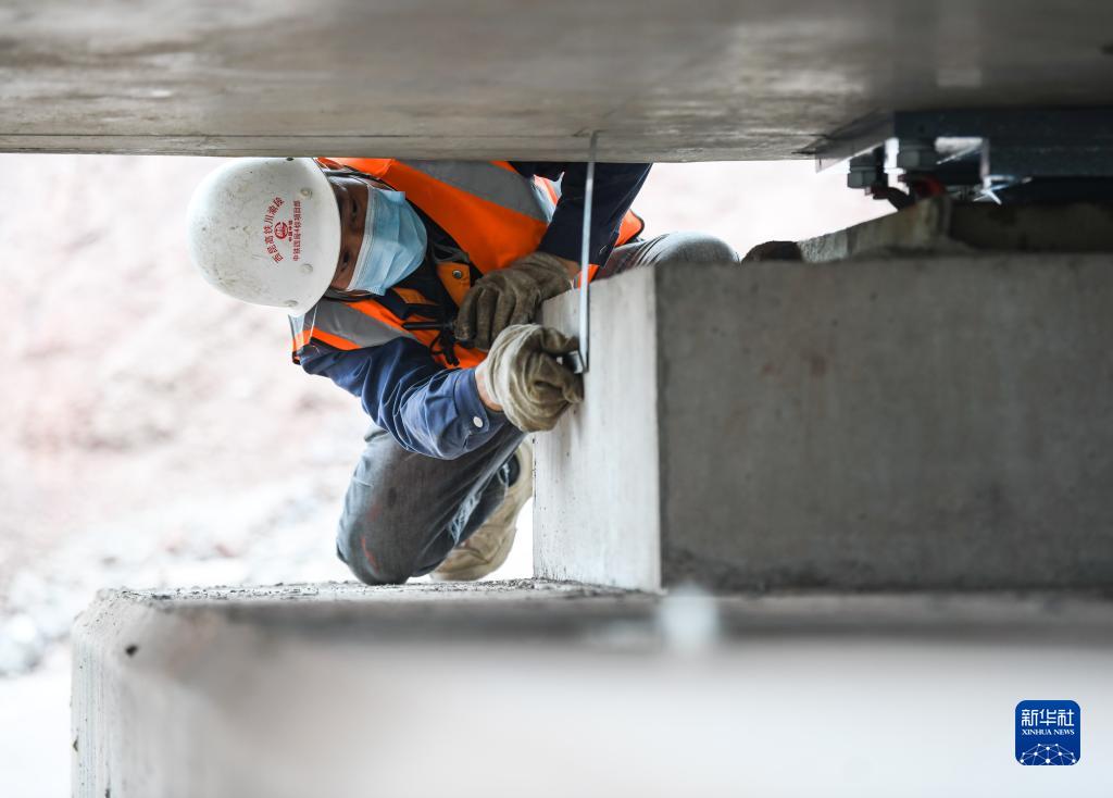 11月24日,在渝昆高鐵瀘宜段架梁施工現場(chǎng),施工人員在校對箱梁墊石標高。