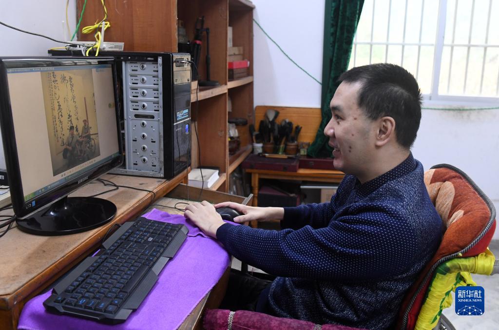 11月24日,在都安瑤族自治縣大興鎮九頓村那內屯家里,王金寶用電腦查閱有關(guān)資料。