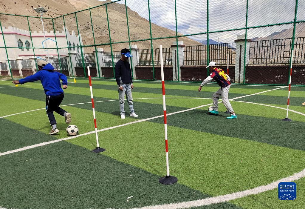 在西藏日喀則市定日縣扎西宗鄉完全小學(xué)的球場(chǎng)上,足球興趣小組的教練普次(中)在指導學(xué)生帶球繞桿(4月21日攝)。