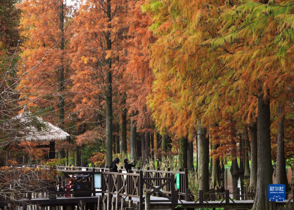 近日,上海青西郊野公園“水上森林”的水杉、池杉、落羽杉等枝頭盡染,風(fēng)景如畫(huà)。