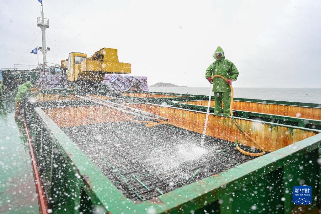 11月25日,在福州連江縣苔菉鎮后灣海域,漁民在運輸船上沖洗鮑魚(yú)養殖箱。