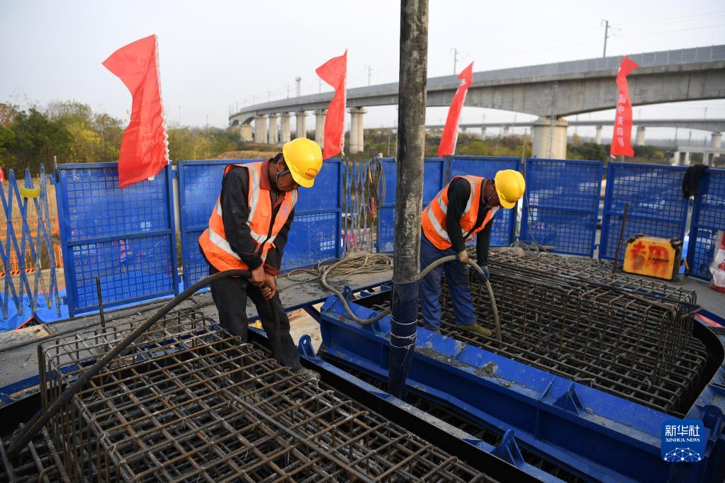 11月26日,中鐵四局施工人員在新建滬寧合高鐵安徽段首根墩身澆筑現場(chǎng)作業(yè)。
