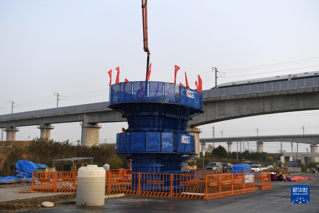 11月26日,中鐵四局施工人員在新建滬寧合高鐵安徽段首根墩身澆筑現場(chǎng)作業(yè)。