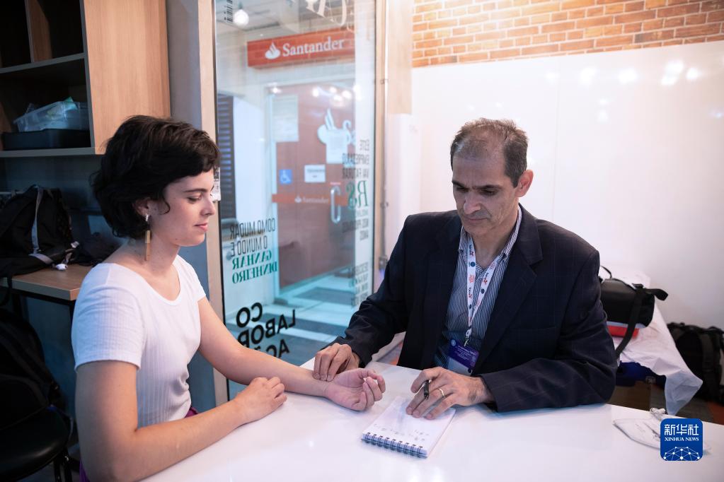 11月26日,在巴西圣保羅舉行的世界中醫藥大會(huì )上,一名中醫(右)為嘉賓把脈。