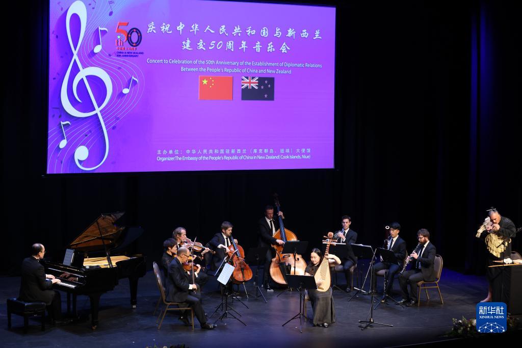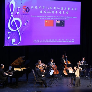 中國駐新西蘭大使館28日晚在新西蘭首都惠靈頓國家博物館舉辦慶祝中新建交50周年招待會(huì )和專(zhuān)場(chǎng)音樂(lè )會(huì )。包括新西蘭外長(cháng)馬胡塔和前外長(cháng)布朗利等政要、外國駐新使節、各界友好人士以及華僑華人代表約300人出席。新華社發(fā)(孟韜攝)