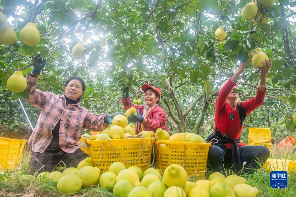 11月28日,在永州市道縣梅花鎮赤源村柚子種植基地,村民在采摘柚子。