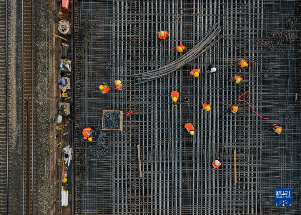 11月28日,工人在渝昆高鐵川渝段華福特大橋施工現場(chǎng)作業(yè)(無(wú)人機照片)。