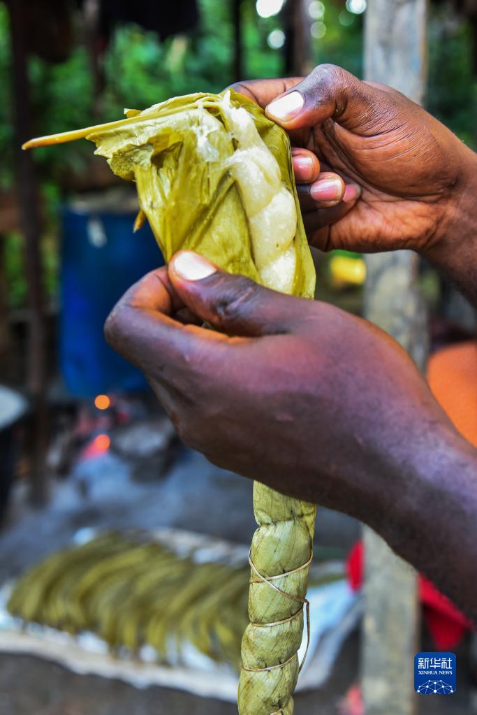 木薯是喀麥隆百姓重要的傳統糧食作物。成熟的木薯塊根經(jīng)過(guò)清洗、削皮、切碎,再放入水中發(fā)酵,根據發(fā)酵時(shí)間的不同,木薯碎根可以制成不同的衍生品,比如木薯棒和木薯“古斯古斯”。