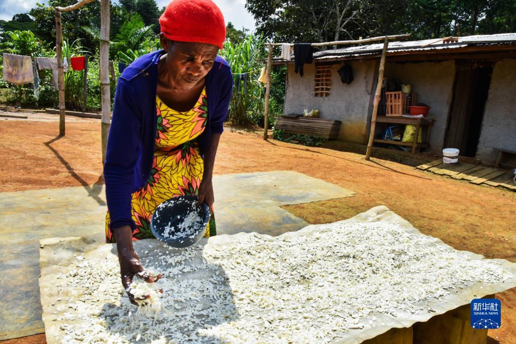 11月16日,在喀麥隆南部大區曼貢市一村莊,一名婦女在曬木薯塊。
