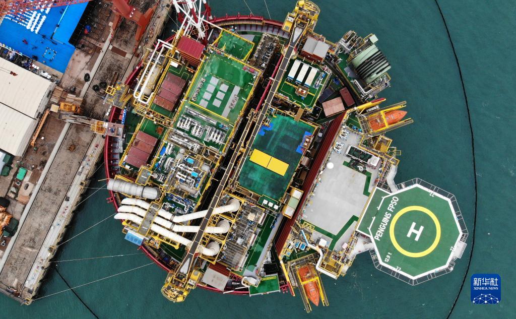 這是11月29日在山東青島拍攝的企鵝圓筒型浮式生產(chǎn)儲卸油裝置(FPSO)(無(wú)人機照片)。