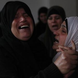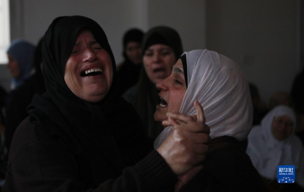 11月29日,在約旦河西岸城市希伯倫北部的拜特烏邁爾,人們在被以色列軍隊打死的巴勒斯坦人的葬禮上哭泣。