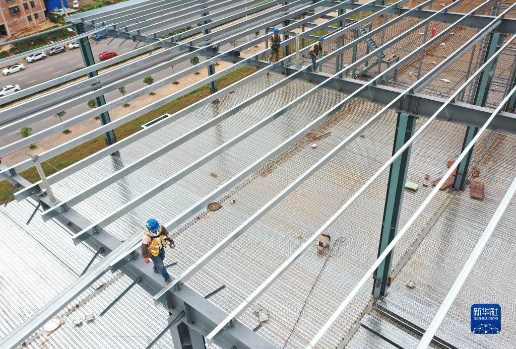 工人在中新南寧國際物流園的電商物流園進(jìn)行頂棚施工(11月29日攝,無(wú)人機照片)。