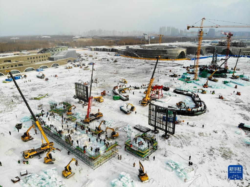 這是11月29日拍攝的哈爾濱冰雪大世界園區冰建項目施工現場(chǎng)(無(wú)人機照片)。