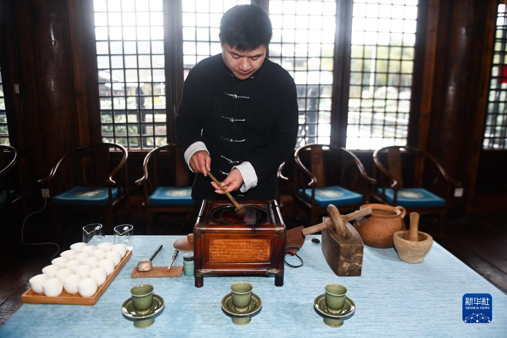 11月30日,大唐貢茶院的紫筍茶制作技藝傳承人林瑞煬采用傳統方法煮茶。