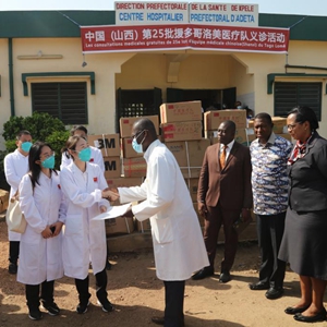 11月30日,中國第25批援多哥醫療隊向多哥佩萊省阿代塔鎮衛生所捐贈醫療物資。