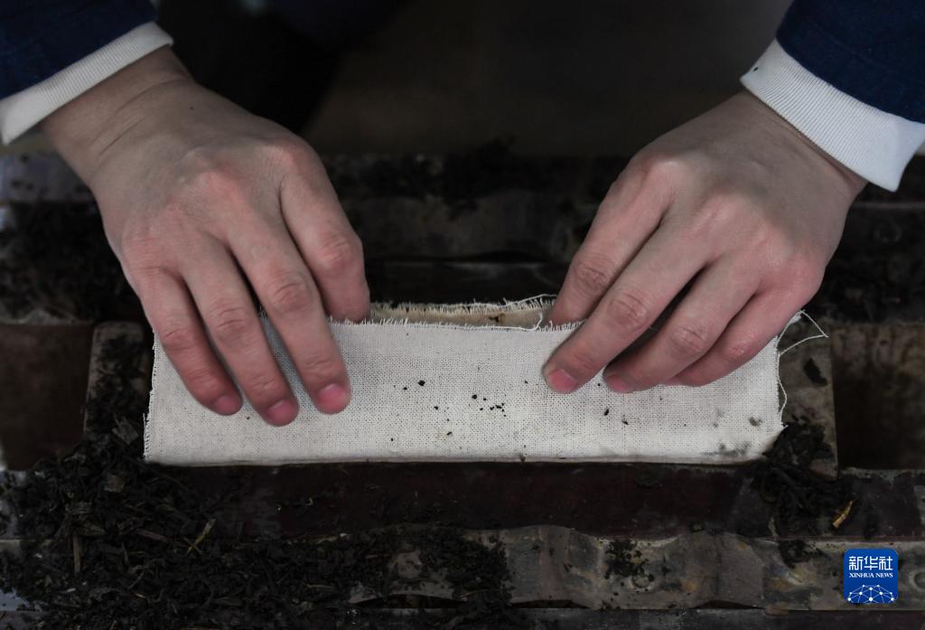在咸陽(yáng)“益生源記”仿古茯茶作坊,筑茶師劉林展示灌封工藝(11月30日攝)。
